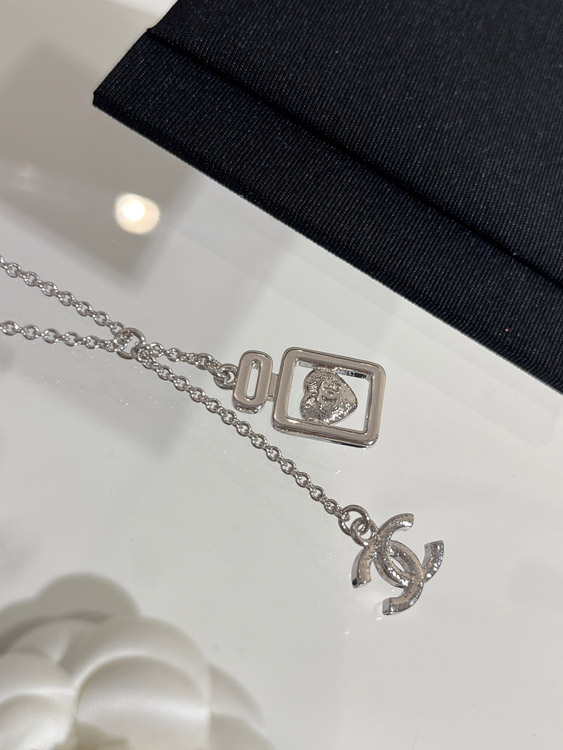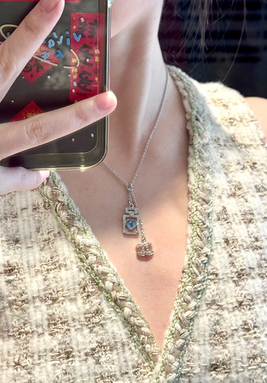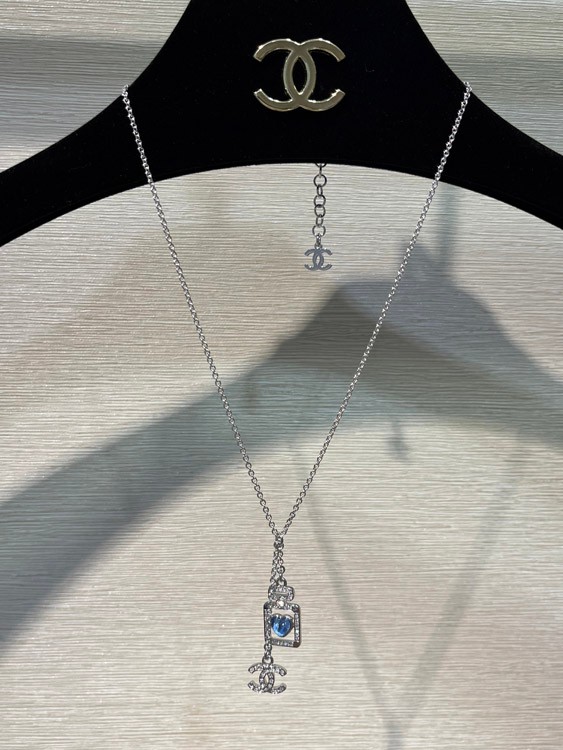 Chanel blue heart silver full diamond double C perfume bottle necklace-3750