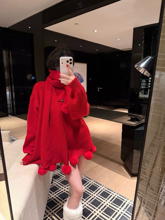 Miu Miu new arrival Rabbit fur pom-pom knitted sweater and scarf set (two-piece set)-5386